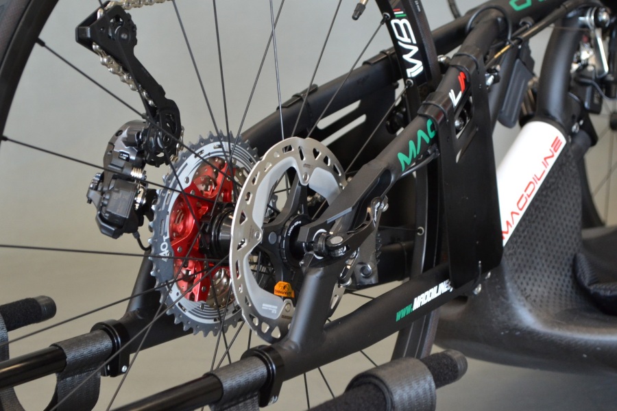 Handcycle: If there is a braking system for the double wheels of a handcycle, it must act on both wheels. The braking systems must be dynamic; braking on just one wheel is not permitted. Disc brakes are authorised.